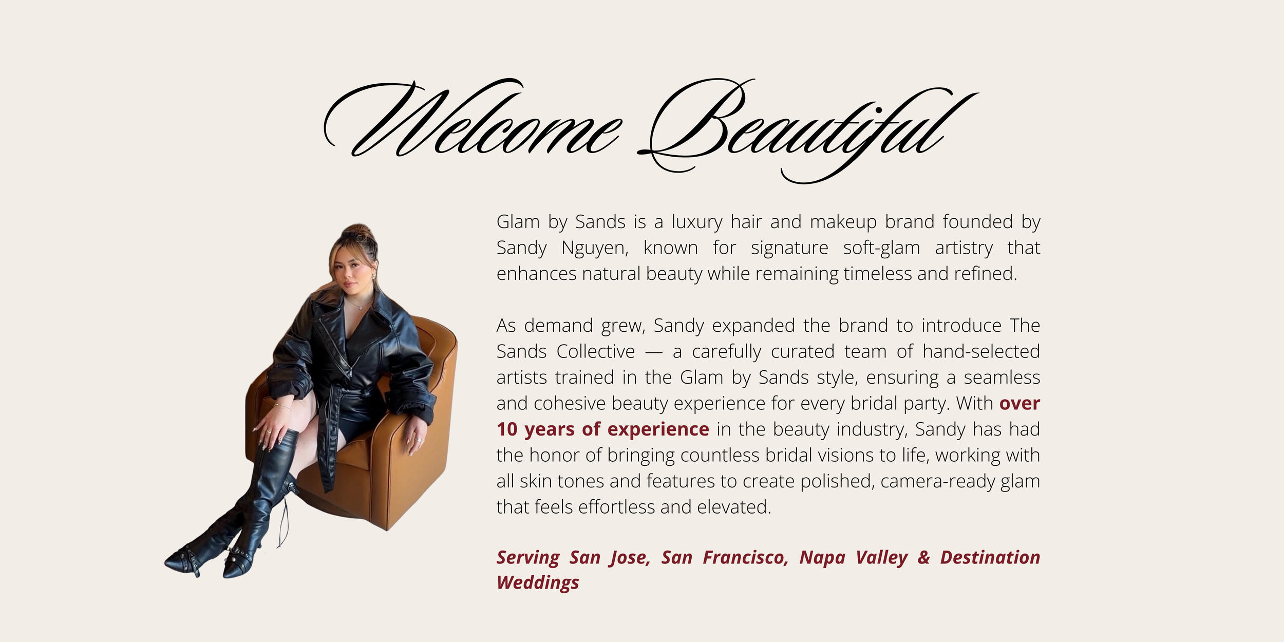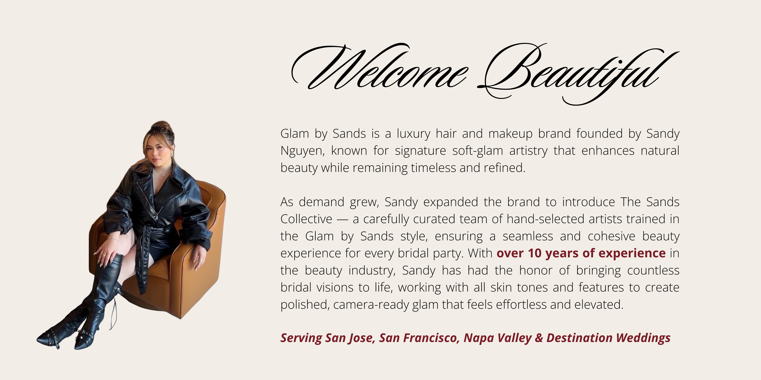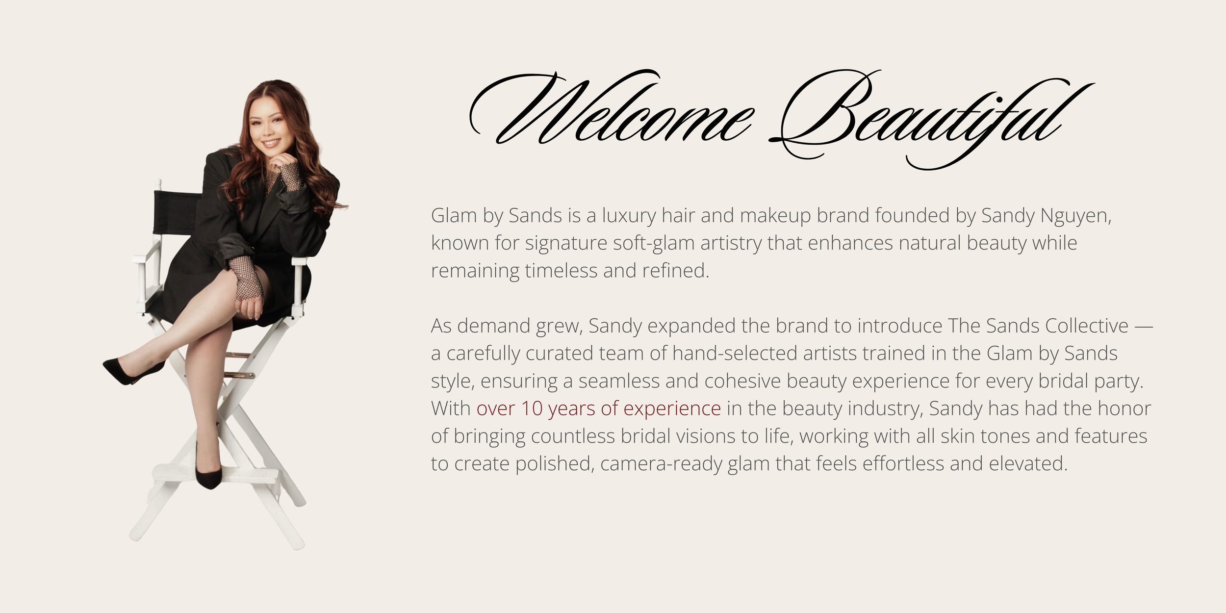 The Sands Collective is a carefully curated team of artists trained in the signature Glam by Sands soft-glam style. Led by Sandy Nguyen, the collective was created to provide a seamless beauty experience for larger bridal parties and special events.
